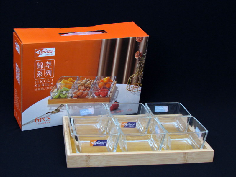 SET STAKLENIH ČINIJA 1/6 NA DRVENOJ TACNI
